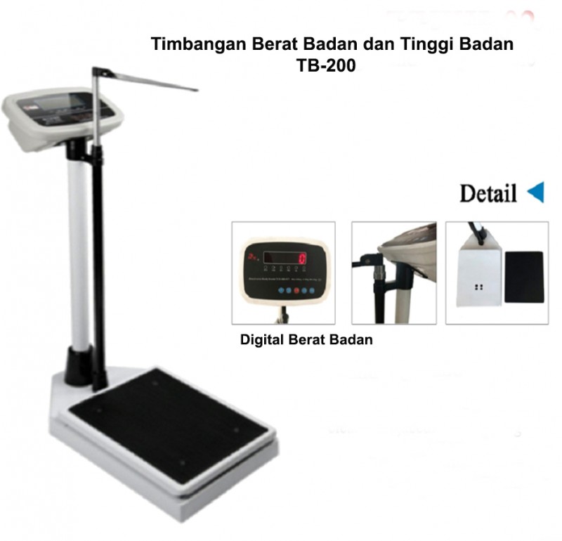 Timbangan Badan type TB-200 merupakan peralatan timbangan dua fungsi yaitu untuk mengukur berat badan secara digital dan pengukuran tinggi badan secara manual dengan menggunakan tiang mistar yang dilengkapi dengan deret angka dari 70cm hingga 200 cm. Timbangan Berat badan ini mudah di pergunakan karena pembacaan secara digital dengan hasil pengukuran tampak jelas dan terang. Pada bagian bawah yaitu injakan merupakan anti slip atau injakan anti licin